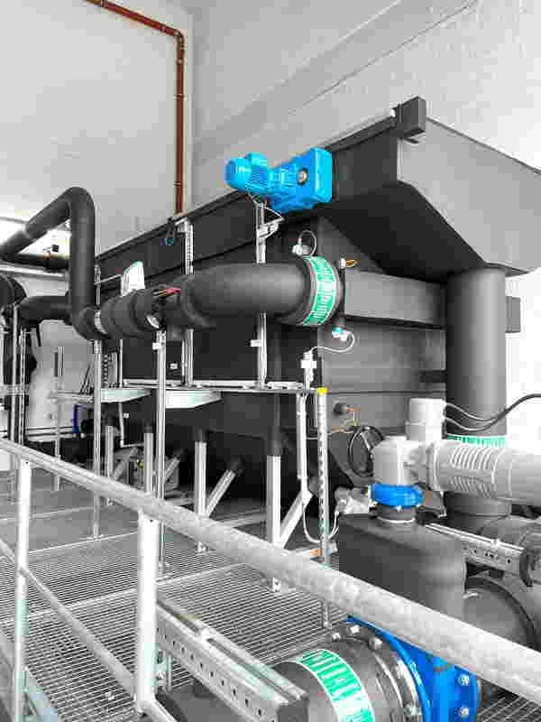 Flusswasser als Quellenenergie: Durch biologische Aktivitäten im Flusswasser kann die Wärmepumpe nicht direkt beschickt werden. Biofouling, also unerwünschter Bewuchs von Unterwasserstrukturen durch Mikroorganismen, Pflanzen, Algen und Tiere, beeinträchtigt die Leistung und erhöht den Wartungsaufwand. Deshalb ist ein Abwasserwärmetauscher als Trennstufe installiert: Der Huber Abwasserwärmetauscher RoWin14 überträgt die Energie aus dem Fluss zunächst auf ein sauberes Medium, das Heizungswasser, und ermöglicht damit den Betrieb der Wärmepumpe.