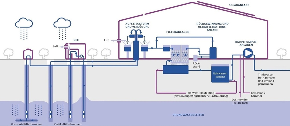 Während das Rohwasser die zwei Meter hohen Kiesfilterschichten durchfließt, werden Eisen- und Manganverbindungen herausgefiltert und Ammoniumverbindungen oxidiert. Das gewonnene Trinkwasser wird durch eine physikalische Entsäuerungsanlage bzw. Zugabe von Natronlauge ins Kalk-Kohlensäure-Gleichgewicht gebracht und fließt in die großen Reinwasserbehälter des Wasserwerks. Leistungsstarke Kreiselpumpen fördern anschließend das Trinkwasser in die Haushalte von Hannover und Umgebung.