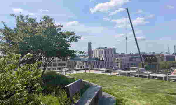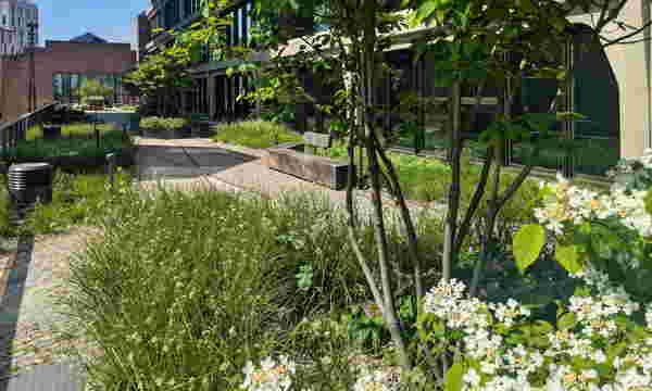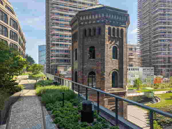 Von den 3000 Quadratmeter Dachfläche wurden rund 2700 Quadratmeter als Retentionsdächer ausgeführt. Diese dienen nicht nur der Speicherung und Nutzung von Regenwasser, sondern schaffen auch grüne Aufenthaltsbereiche mit hoher Aufenthaltsqualität. Besonders hervorzuheben ist die Gestaltung der Mieterterrasse auf dem historischen Eisenbahnviadukt. Intensive Begrünung, Sitzbereiche und naturnahe Vegetation verbinden hier die industrielle Vergangenheit des Standorts mit einer grünen, lebenswerten Zukunft. Insgesamt erfüllt das Projekt die Vorgabe des Umweltamtes, mindestens 50 Prozent der Dachfläche zu begrünen − und geht in seiner Umsetzung deutlich darüber hinaus. Das Regenwassermanagement wurde dabei technisch präzise auf die örtlichen Gegebenheiten abgestimmt. Um den anfallenden Niederschlag gezielt zurückzuhalten, verdunsten zu lassen und bei Bedarf kontrolliert abzuleiten, wurden die oberen Dachflächen mit statischen Ablaufdrosseln ausgestattet. Über Kapillarbrücken gelangt das gespeicherte