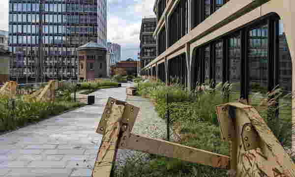 Regenwasser in das darüberliegende Vlies, wo es gleichmäßig verteilt und anschließend vom Substrat aufgenommen wird. Auf diese Weise steht es der Vegetation kontinuierlich zur Verfügung. Das überschüssige Wasser fließt kaskadenartig von den einzelnen Dachflächen in den rund 30 Zentimeter starken Retentionsspeicher über dem historischen Eisenbahnviadukt. Dort sorgt die intelligent gesteuerte Drossel Smart Flow Control dafür, dass das System auf Wetterveränderungen reagieren kann. Sie erkennt bevorstehende Starkregenereignisse und reguliert den Abfluss des gespeicherten Wassers entsprechend der aktuellen Wetterprognosen und des Wasserstands in den Optigrün Retentionsboxen.